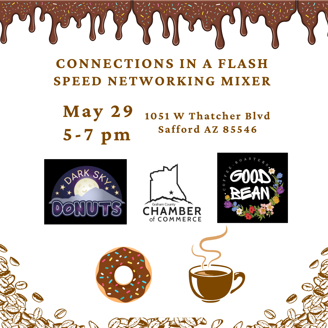 The Graham County Chamber of Commerce invites local professionals, entrepreneurs, business owners, and community leaders to a Speed Networking Mixer on Wednesday, May 29, from 5:00 to 7:00 PM, in the Gila Valley Community Room at the Chamber office located at 1051 W Thatcher Blvd, Safford, Arizona 85546.