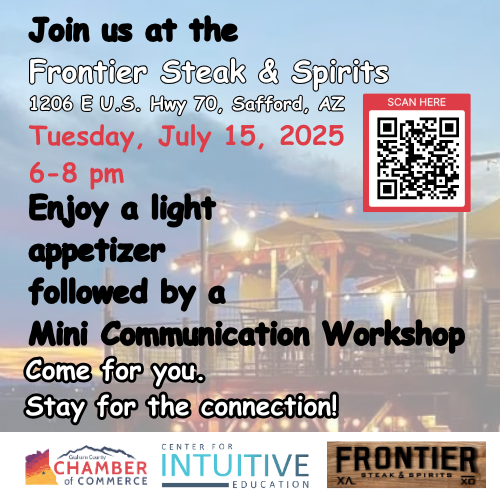 The workshop will be led by Kay Ekvall, membership director at the Graham County Chamber of Commerce. It is sponsored by the Center for Intuitive Education and hosted by Frontier Steak & Spirits.