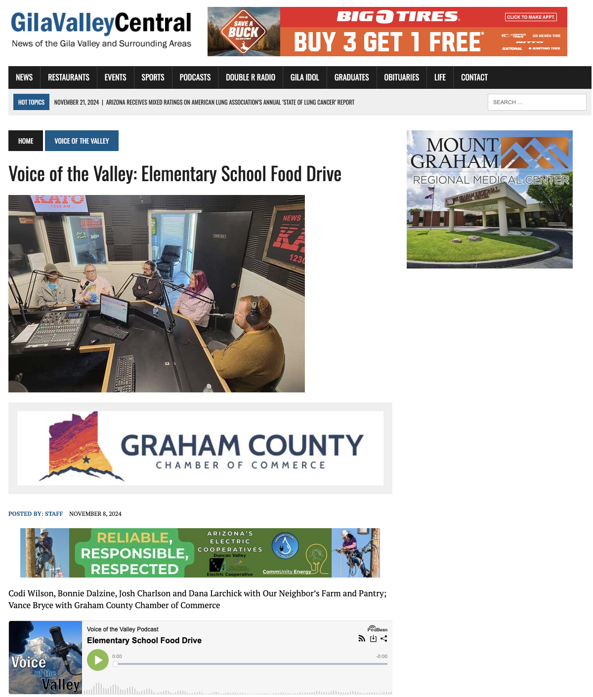 Codi Wilson, Bonnie Dalzine, Josh Charlson, and Dana Larchick with Our Neighbor’s Farm and Pantry, along with Vance Bryce from the Graham County Chamber of Commerce, were guests on Voice of the Valley to discuss the Elementary School Food Drive.